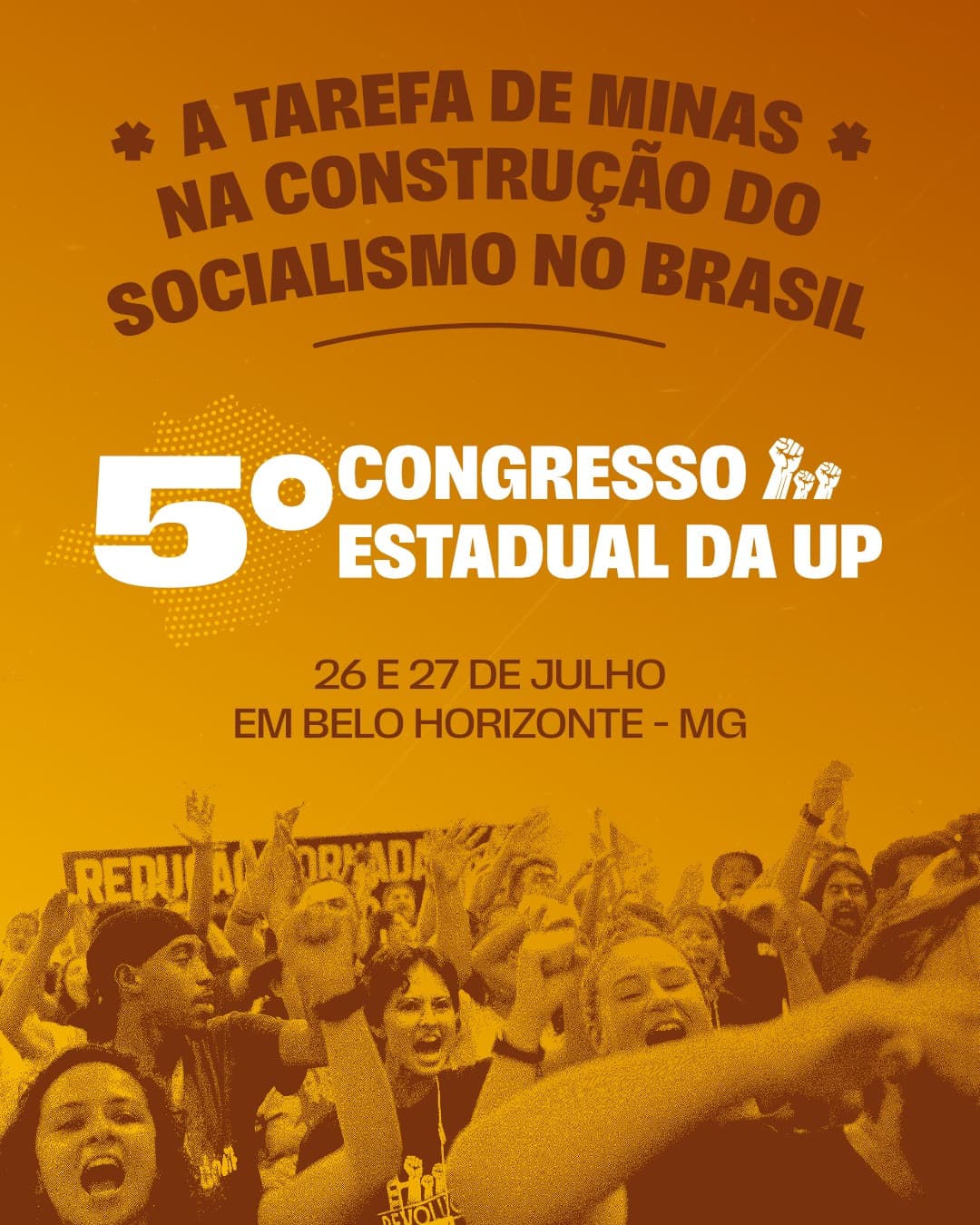 Por isso, com grande entusiasmo e compromisso revolucionário, o Diretório Estadual da UP convoca o 5º Congresso Estadual da Unidade Popular – Minas Gerais, sob o lema: A tarefa de Minas Gerais na construção do socialismo no Brasil